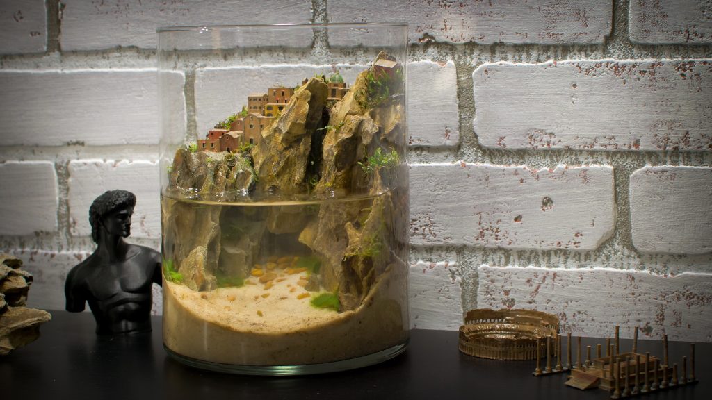 Today I’m going to walk you through the process of making a coastal village cliffside terrarium with an aquatic overlook (that’s a really fancy way to describe a paludarium, isn’t it). This will be the first of a couple of living dioramas I’m making for the Italiano series.