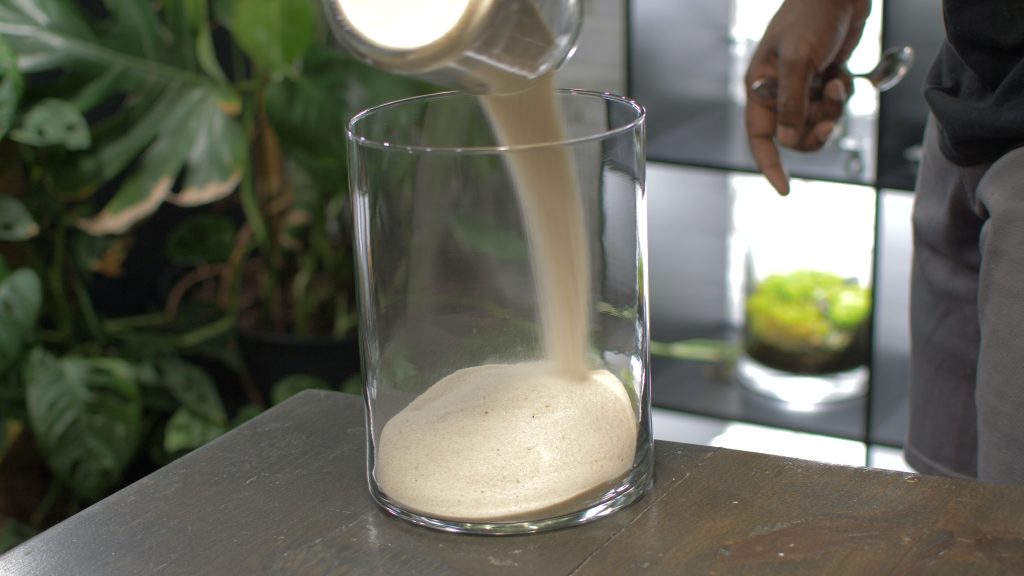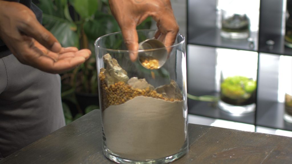 So let me show you my process, and it starts with the 5-inch round vase I tend to use for most of my aqua terrariums. With a couple of cups of sand, I pour a substrate that’s about an inch and a half thick. This will make it easier to balance the hardscape as we figure out the arrangement.