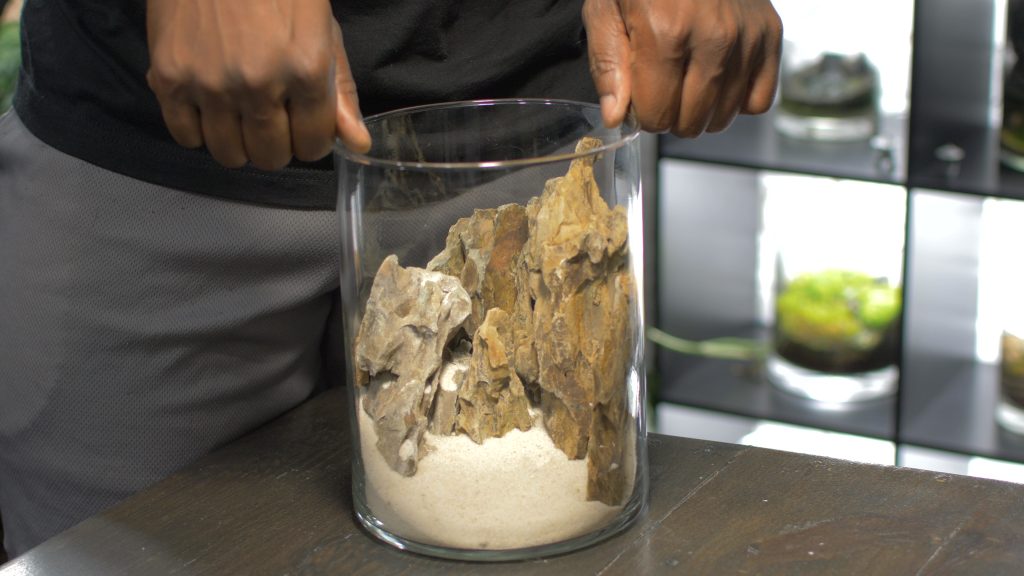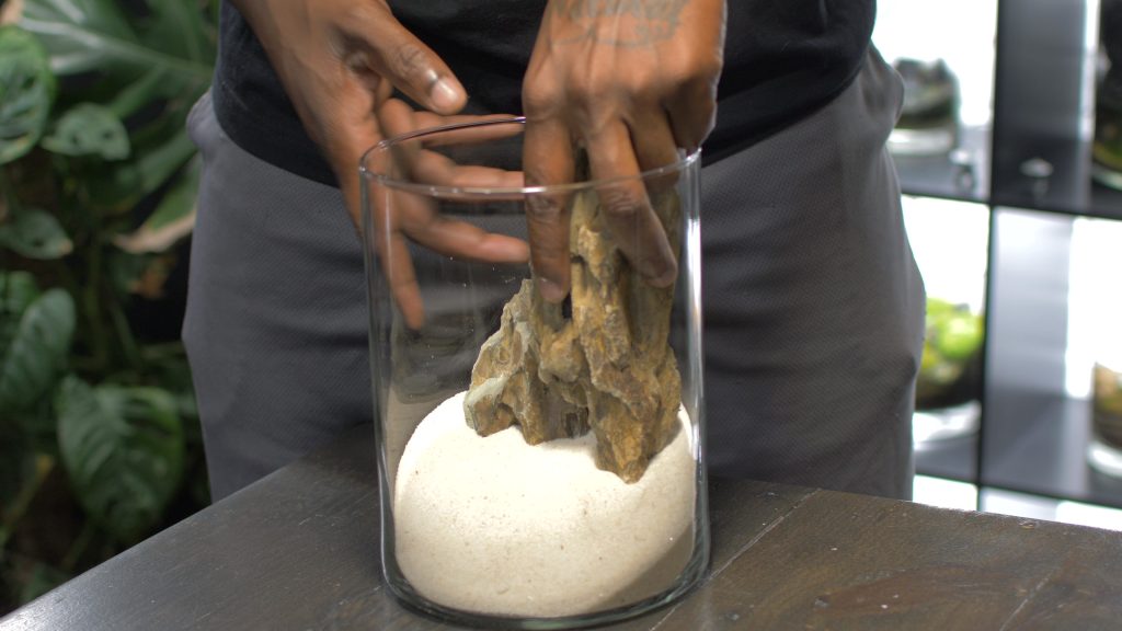 I like the jagged edges this stone naturally has, but finding a neat way to arrange them did prove to be a little challenging. Once I started to find a formation I liked, I shifted the glass continually to create a slope for the sand to fall around the rocks. The idea here is to create a natural look of sediment as if the rock is slowly transitioning into the sand.