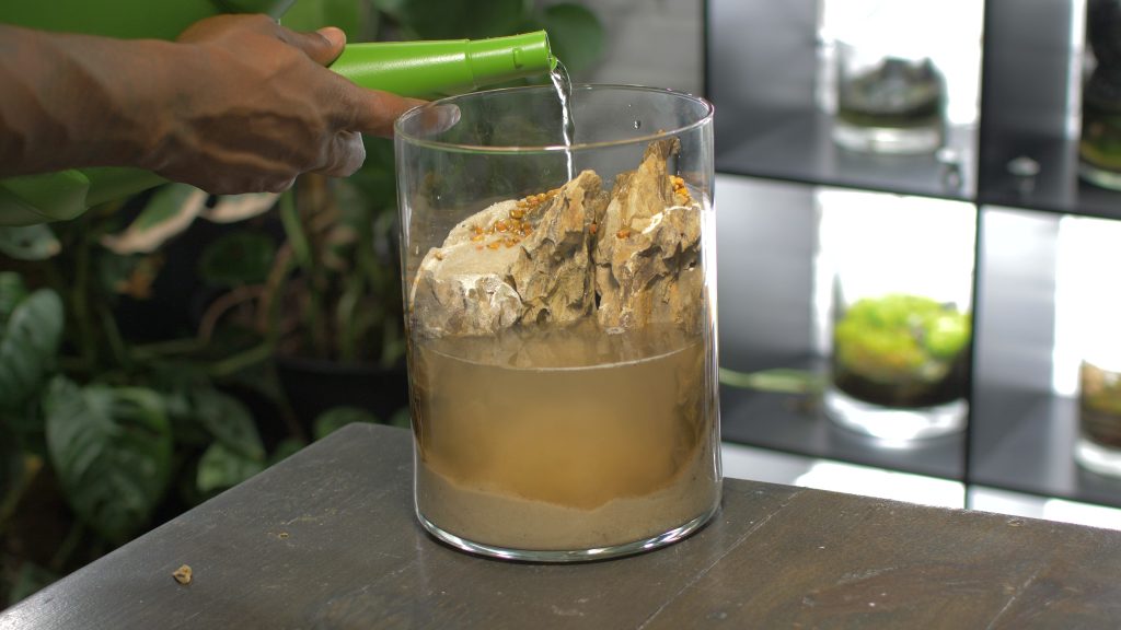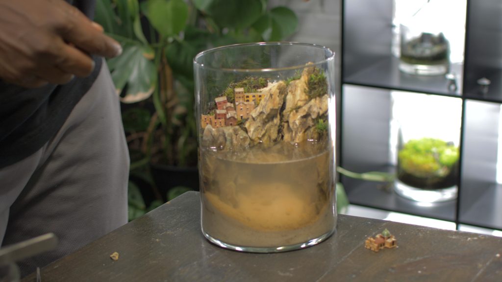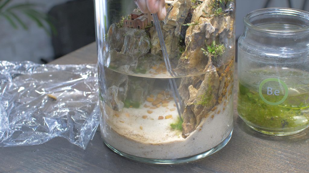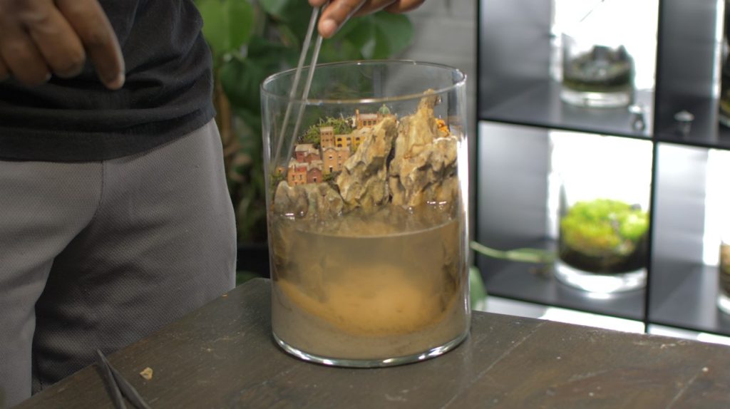 Once the base is formed with the pebble stones, an additional layer of sand and soil can be added to create the first layer of our terrarium substrate. The models are then placed in and arranged accordingly, and clean water is added to the setup.