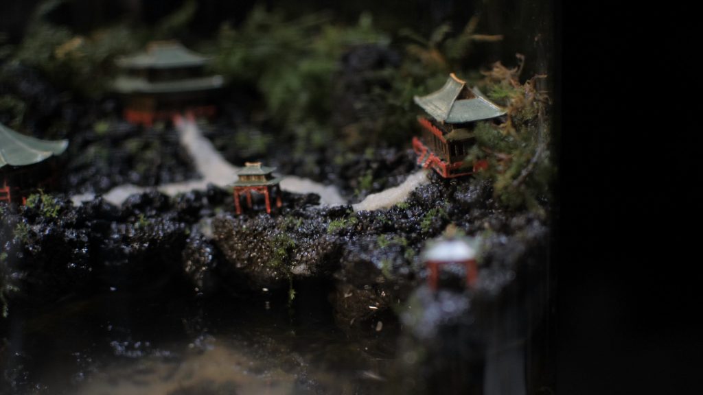 In our first tank, we introduced the meaning behind my motivation to make this series with a Shinzo sculpture jungle terrarium. We lit things up with the second living diorama while elaborating on the structure behind Shintoism with a tōrō lantern and, rock garden terrarium. This enclosure will aim to take things up a few notches by scaping out an entire village in a paludarium.